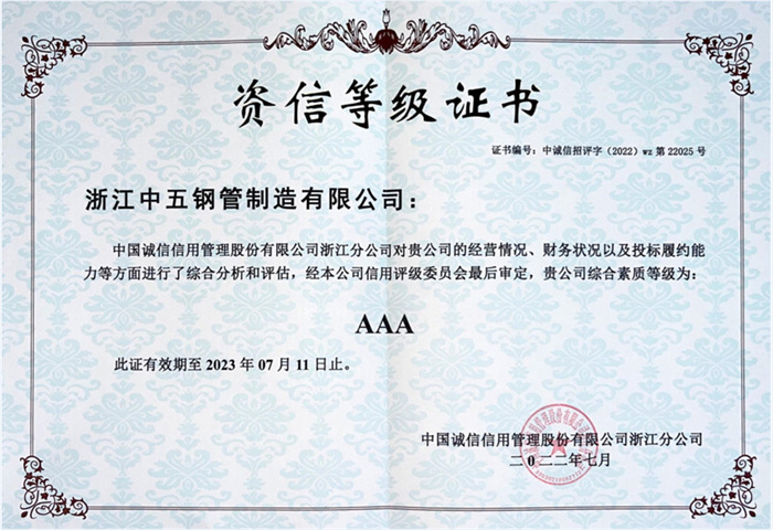 公司因在诚信方面的突出表现,在2022.7被中国诚信信用管理股份有限公司浙江分公司评为资信等级AAA。